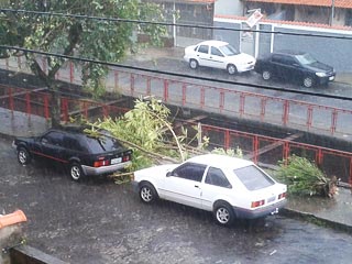 Ainda no sábado, outro desmoronamento, desta vez de um galpão em um canteiro de obras, foi registrado pelos Bombeiros na rua Ivan Batista de Oliveira, no bairro Milho Branco, ocasionando uma vítima, que foi atingida pelos destroços na região do rosto. Ela foi encaminhada para o HPS, aonde recebeu atendimento médico por volta das 17h20. Além disso, o órgão identificou quedas de árvores e destelhamentos pela cidade, principalmente na Zona Norte, mas ninguém ficou ferido. A foto acima mostra a queda de galhos em cima de um carro, ocorrida também no sábado, na avenida Santa Luzia, no bairro de mesmo nome.