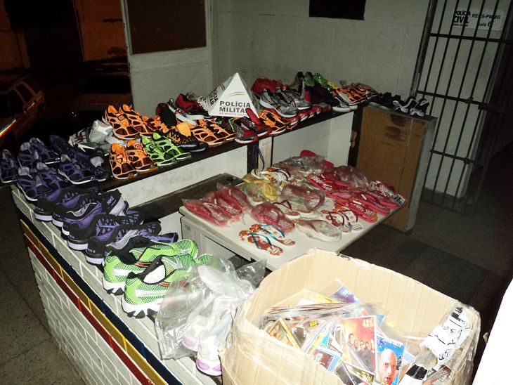 Foram localizadas cerca de quatro mil mídias, 42 pares de tênis e 27 pares de chinelos, todos falsificados