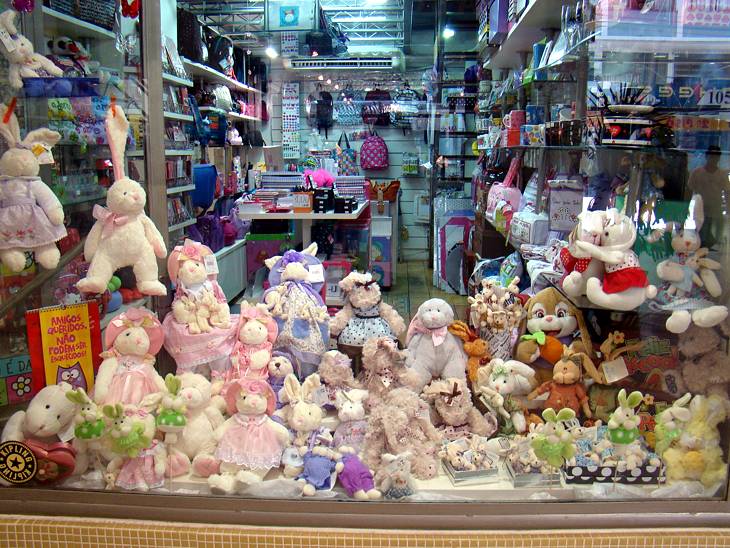 Coelhos de pelúcia enfeitam vitrine para a PáscoaO presente é uma alternativa para quem não consome chocolate. Bichinhos são usados ainda para enfeitar as cestas de Páscoa