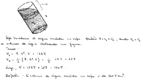 Um copo cilíndrico de diâmetro 8 cm e altura 12 cm contém água. Inclinando o máximo possível esse copo, sem derramar a água, obtemos a medida descrita na figura abaixo. Determine o volume de água contida no copo.