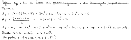 A base e a altura de um paralelogramo medem x ? 2 e 2x + 3, respectivamente, e a base e a altura de um triângulo medem x + 1 e 2x, respectivamente, sendo x um número real positivo.