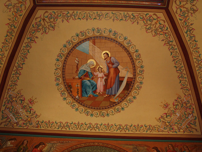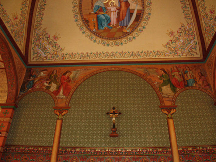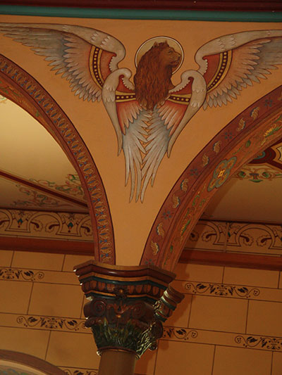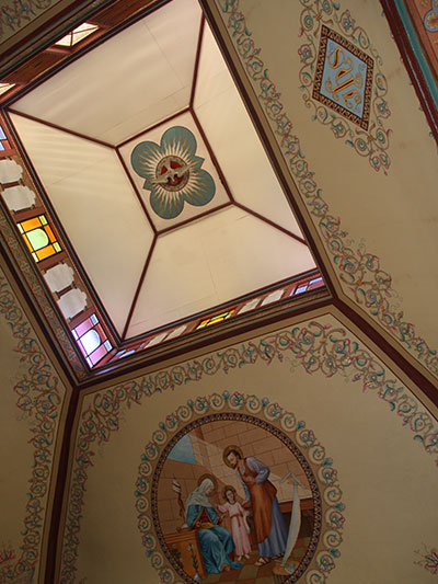 O lanternim, com vidros coloridos, propicia a iluminação. As paredes estão divididas por traços, como se fossem juntas de tijolos. Os anjos dão o tom da purificação, grandes e pequenos, porém restaurados e esplêndidos. Há presença de frases em latim, todas com dizeres sobre a celebração, com desenhos, nos trapézios da cúpula. A vida é celebrada.
