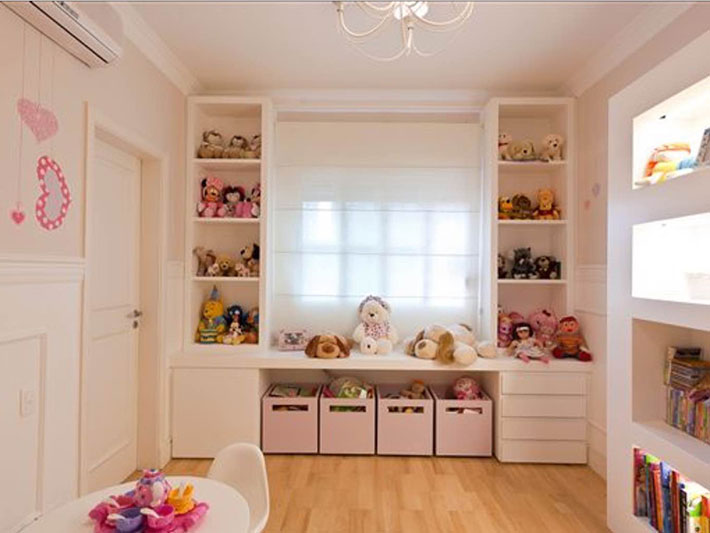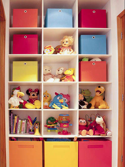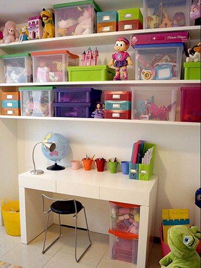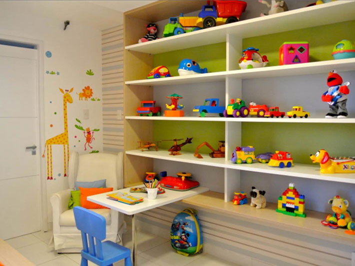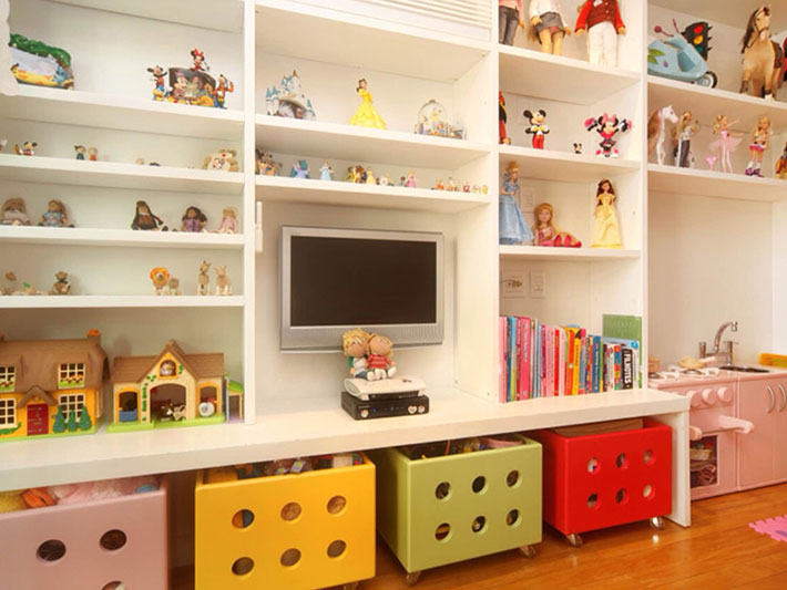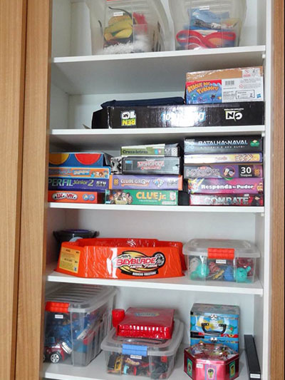 Brinquedos: separe por categorias, organize em nichos, prateleiras ou caixas plásticas com adesivos. Deixe ao alcance os mais usados, incentivando às decisões de escolha.