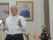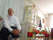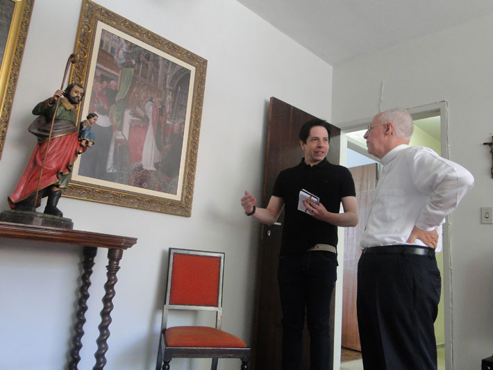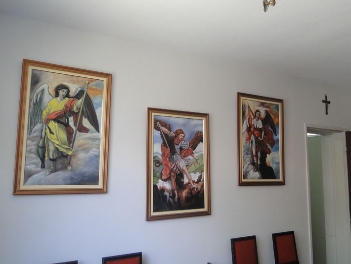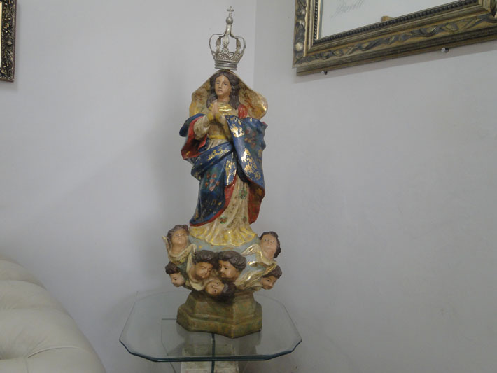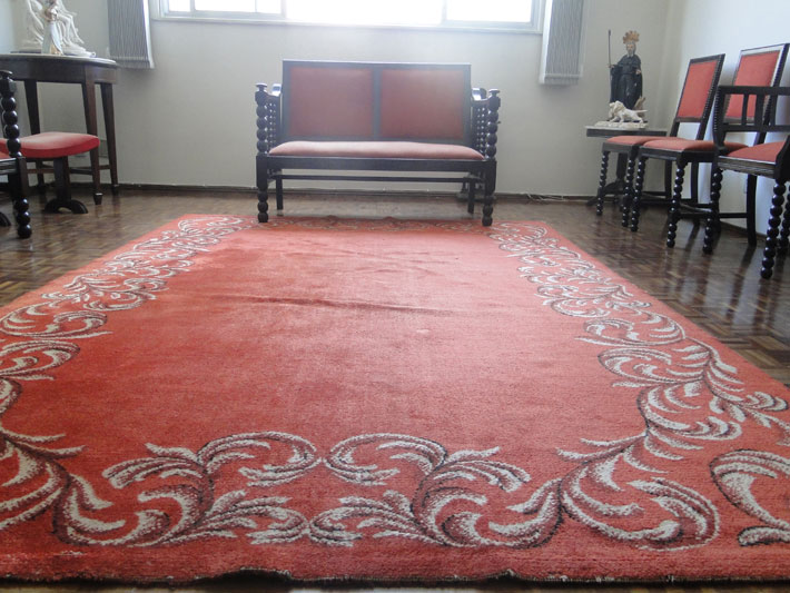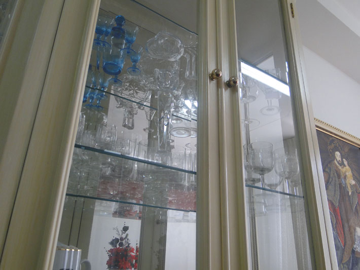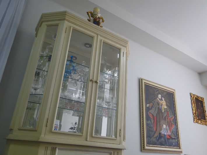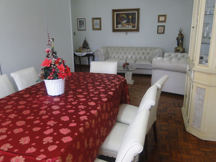 Com sofá claro e mesa de centro em vidro. As paredes contemplam quadros com molduras clássicas, em especial um com a imagem de São Gil, presente recebido por ele. Contou a história do santo, mostrou uma escultura ilustrativa que fica à mostra, em um canto de uma sala. A cristaleira armazena todo acervo de copos e louças.