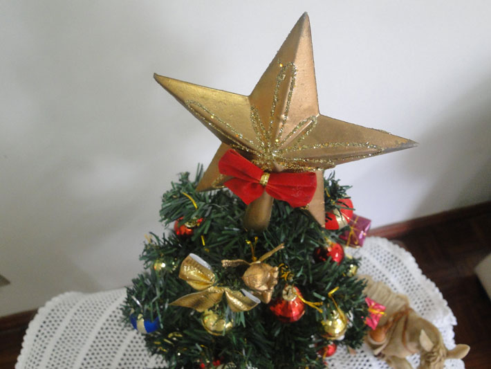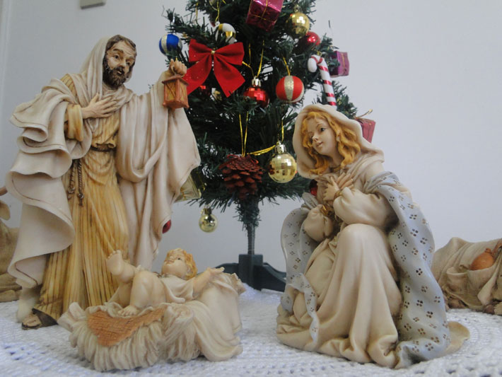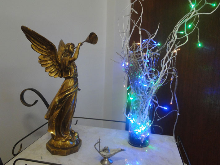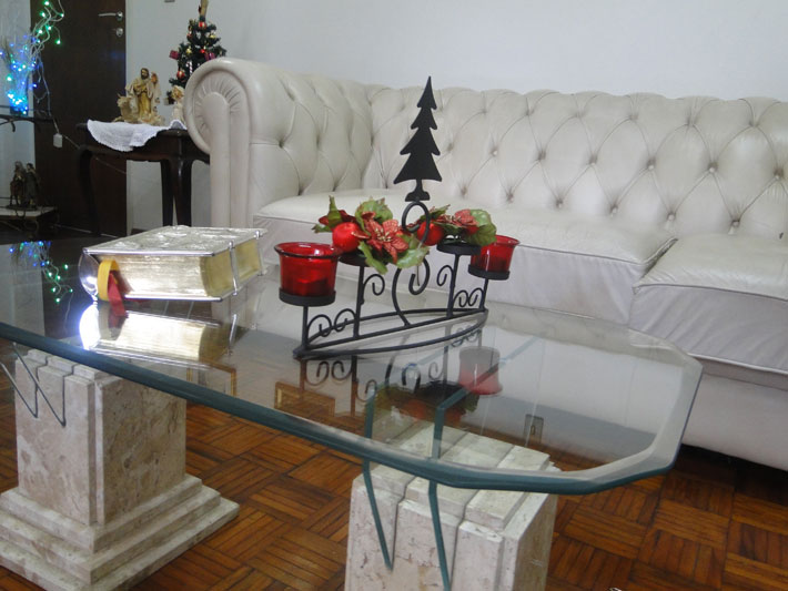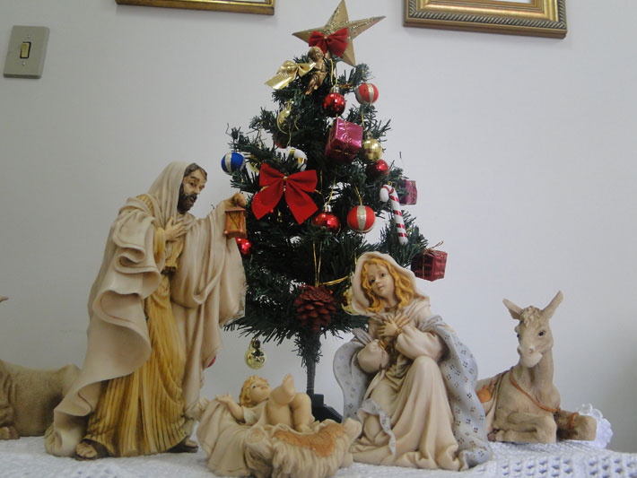 A árvore de natal estava ao lado do sofá, delicada, alegre e promovendo a contemplação necessária para ser admirada. O presépio singelo, irradiava toda a palavra litúrgica. Em outro ângulo, o "Anjo da Anunciação ", dourado, juntamente com uma árvore de galhos e luzes irradiavam a paz!