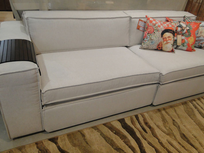 O sofá recebeu almofadas laranja para fazer referência ao Natal, o Papai Noel de resina, com tamanhos diferentes, foram colocados em evidência, promovendo a continuidade do clima festivo.
