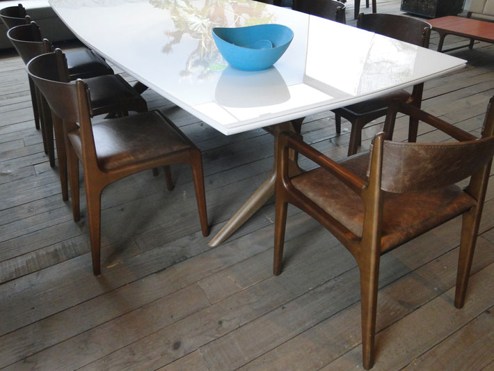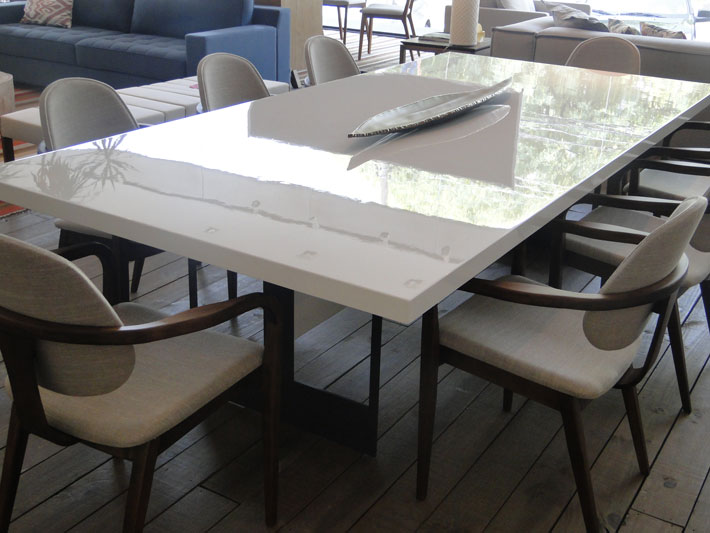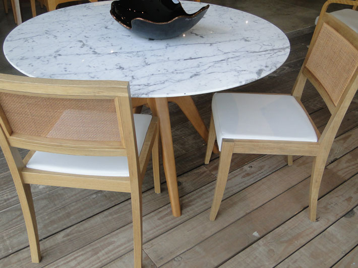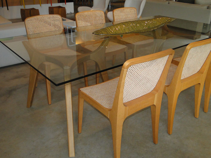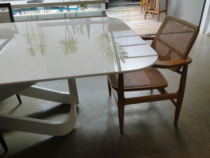 Dica: o contraste de materiais como a laca branca e vidro na mesa e a madeira na estrutura das cadeiras, cria um contexto uniforme e texturas diferentes.