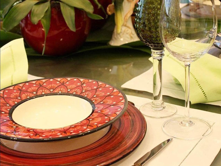 Os pratos de louça trazem uma certa informalidade para o ambiente, criam uma atmosfera leve e com uma sensação de planejamento. Agrega a sofisticação descontraída e o clima de festa. Os pratos coloridos, valorizam à mesa, não precisam de muitos acessórios para compor os detalhes. Os aparelhos de vidro são práticos e precisam de toques com cores, para o ambiente não parecer sem vida.