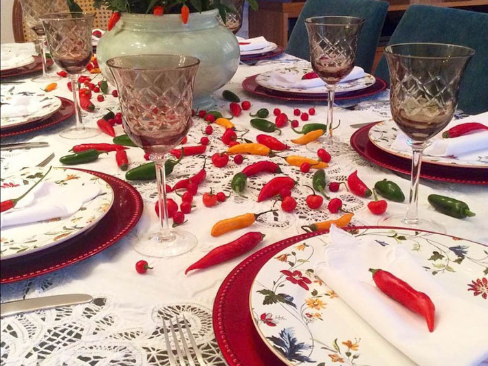 Não use flores que exalam cheiros excessivos, inibem o perfume da comida a ser degustada, e o seu sabor poderá ser comprometido. Lírios exalam muito perfume, não recomendo, a não ser o da paz, que tem o seu lugar. Bromélias e suculentas podem e devem ser usadas, desde que colocadas em cachepôs pequenos para não ocuparem o espaço.
