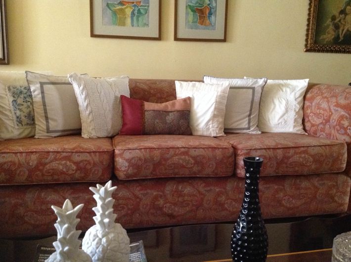 Não "carregue" um sofá ou cama com muitas almofadas. Sempre use uma composição ímpar, nada de duas almofadas juntas de cada lado do sofá. Tente três ou mais (de cada lado), assim o sofá e o ambiente será um sucesso!