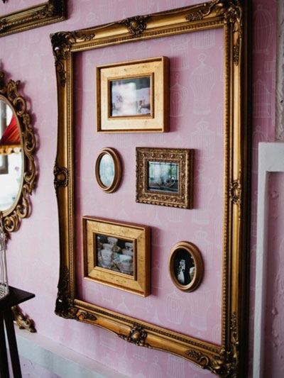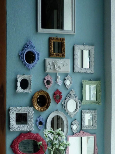 As molduras vazias funcionam muito bem em qualquer tipo de decoração, deixando as paredes preenchidas e bastante originais. As composições podem ser feitas com molduras diferentes, coloridas ou neutras, de qualquer tamanho ou espécie, sendo uma forma econômica para quem não pode investir em quadros, uma obra assinada por um artista.