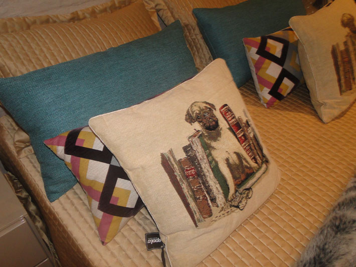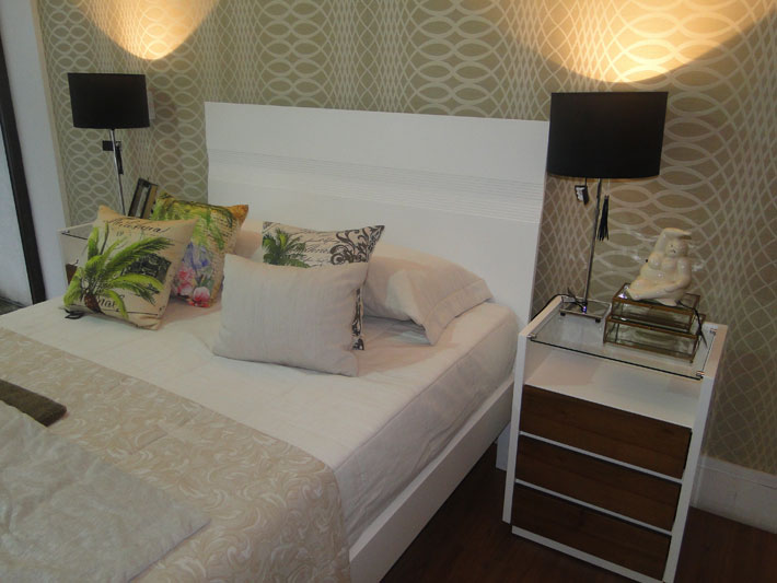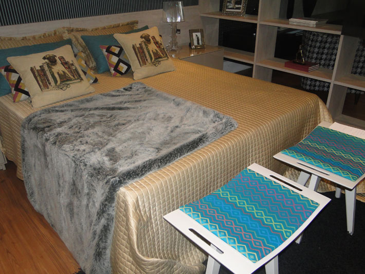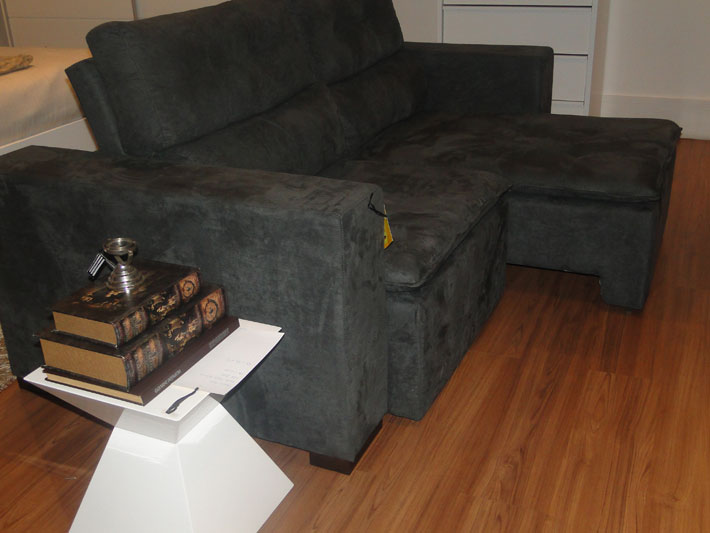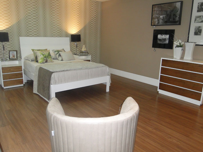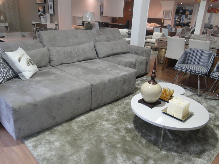 Entre os vários ambientes configurados no amplo show room da loja, é possível destacar o sofá retrátil Visotto, com tecido em suede cinza, ideal para ambientes compactos, uma união para assistir TV e receber os amigos. A laca Fendi (bege claro), promove a leveza monocrática de uma das mesas laterais, destacada pela sutileza de como estava exposta. O tom amadeirado está em alta, como o Sunomono Castanho, comenta a consultora de vendas e designer de interiores da Apolo, Elaine Almeida.
