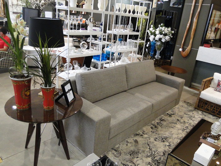 O sofá, composto por tecido de linho mesclado, com detalhes inox, na parte inferior, com assento solto, visando a ergonomia e o conforto, pode ser usado em salas de estar e TV. Entre os objetos, vale destacar, os vasos de cerâmica de cor azul, entre outras peças decorativas.