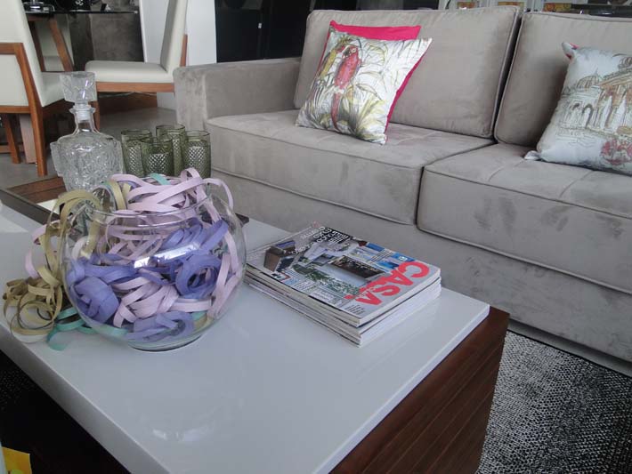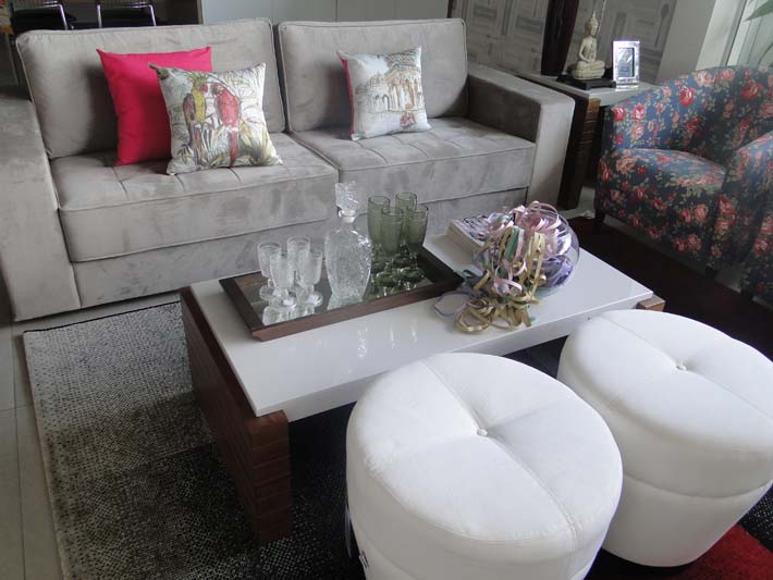 Já na sala, o sofá em tecido de linho, recebeu almofadas de seda pink, com estampas. As poltronas de aproximação com tecido estampado são ideais para espaços compactos, que também recebeu toques carnavalescos nos adereços.