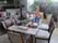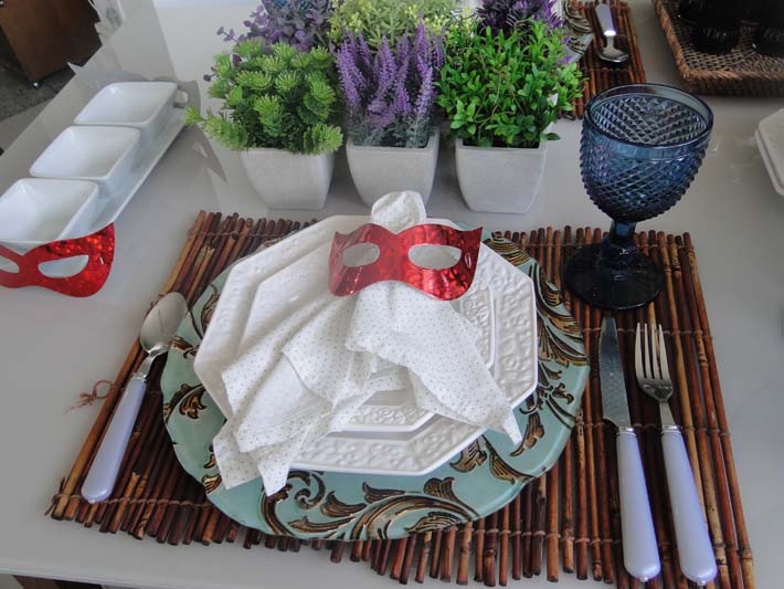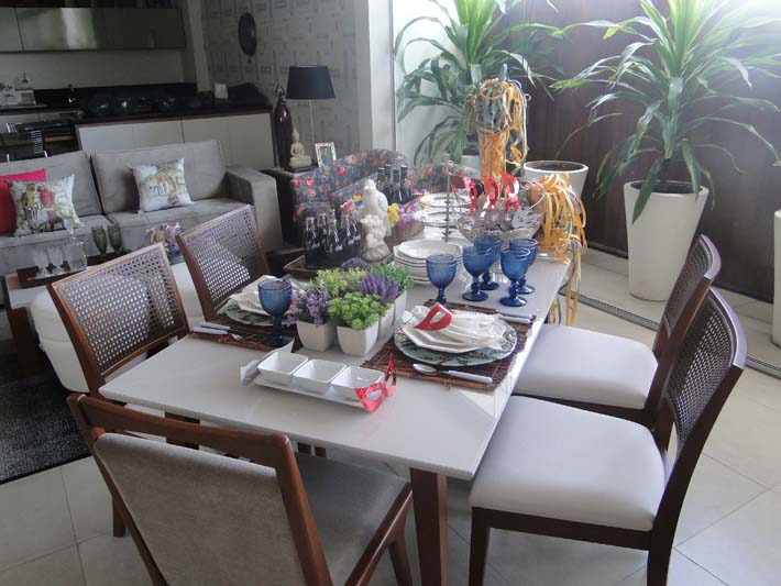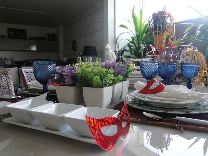 A mesa de jantar de 1,60x90 modelo Legs em laca Off White, recebeu jogos americanos em fibra natural, com sousplat verde claro e folhagens douradas, pratos brancos cestavados com detalhes nas extremidades e faqueiro de aço com madrepérola. As taças em bico de jaca azul, equilibram as cores fortes, harmonizadas com as jarras transparentes, de tamanhos diferentes. As cacatuas e a calopsitas fazem um referência tropical ao país, contrastando com a bandeja e o cesto rústico. Os guardanapos brancos, receberam as máscaras como acabamento, criando mais um efeito colorido. Pequenos vasos com plantas permanentes trazem o verde para o espaço. As cadeiras de tela em madeira castanho claro garantem leveza e o conforto dos convidados.