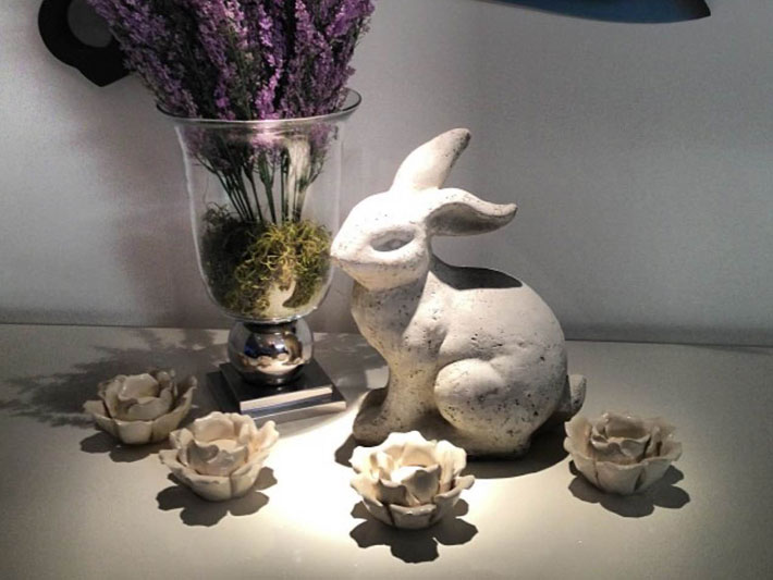 Dicas: Aparadores e mesas laterais, são ótimos itens do mobiliário, para receber vários acessórios decorativos. As guirlandas de Páscoa são as grandes novidades do mercado, expostas com destaque, em portas e janelas. Cachepôs, bandejas, cestos, caixas, flores naturais, coelhos de cerâmica, são peças coringas, que dialogam com o tema Pascoal.