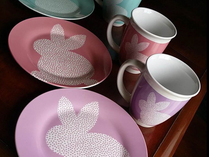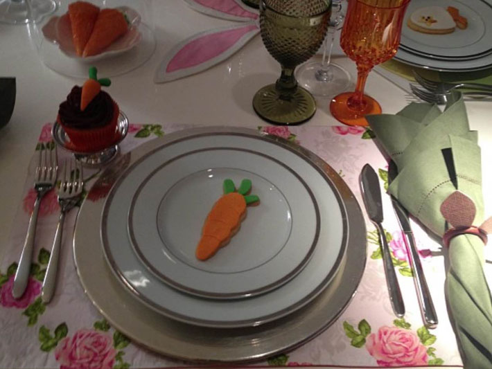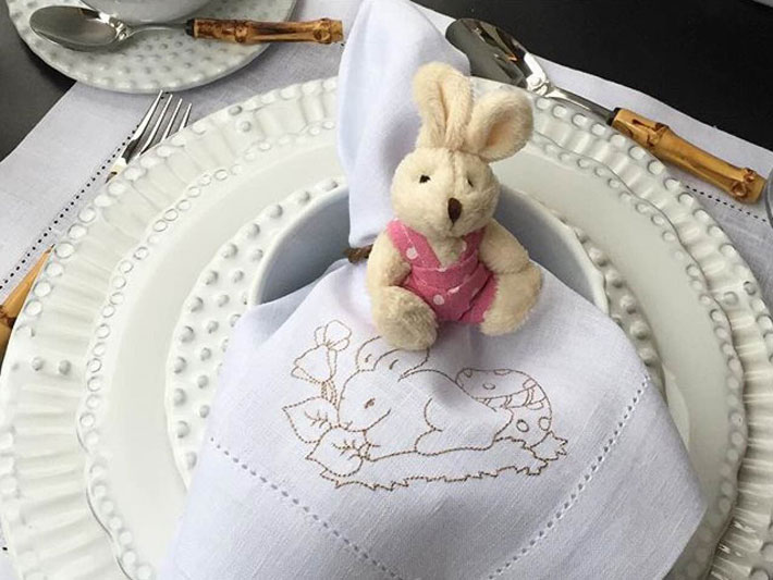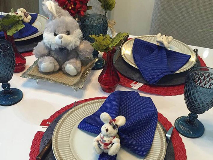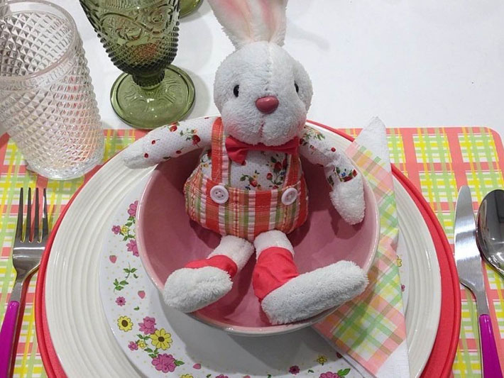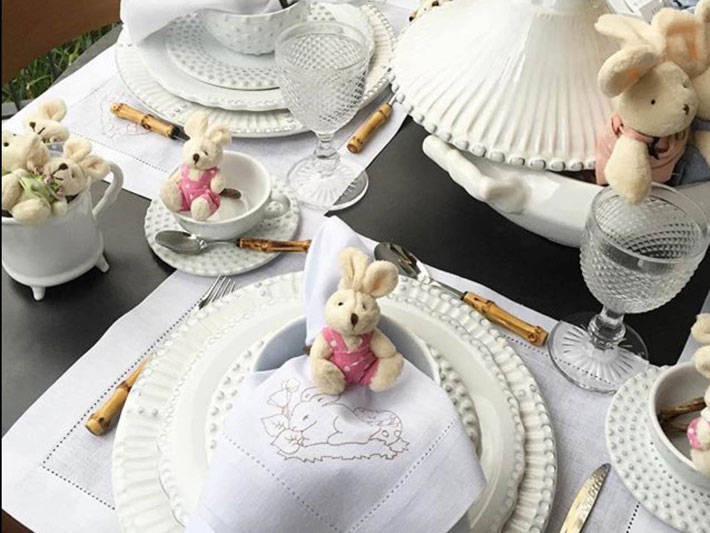 Caso vá receber poucas pessoas ou somente sua família, os jogos americanos são ótimas referências. Para finalizar, agrupe coelhinhos diversos, em cima da mesa, sobre aparadores e mesas de apoio.