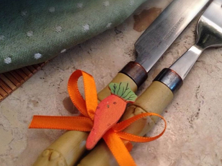 Porta guardanapos de cenourinha, com uma fita colorida, customizam os detalhes, aproveitando o que você já possui. Tudo simples e sofisticado!