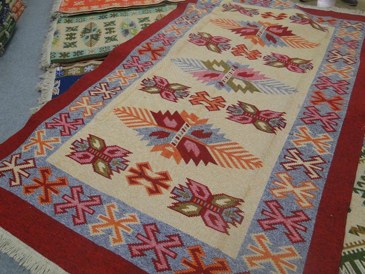 Os tapetes Kilim, confeccionados em tear manual, com padronagens que associam a típica cultura da Turquia, oferecem tamanhos e cores diferentes, para os mais variados tipos ambientes, relata Erlan Korkmaz, expositor e organizador. De Istambul, almofadas bordadas, centros e toalhas de mesa, mostram sua exuberância na sobreposição de bordados, rendas e cores. Muitas peças exibem uma transparência figurativa, fina e delicada, porém, muito resistente ao uso. Peças mais que exclusivas.