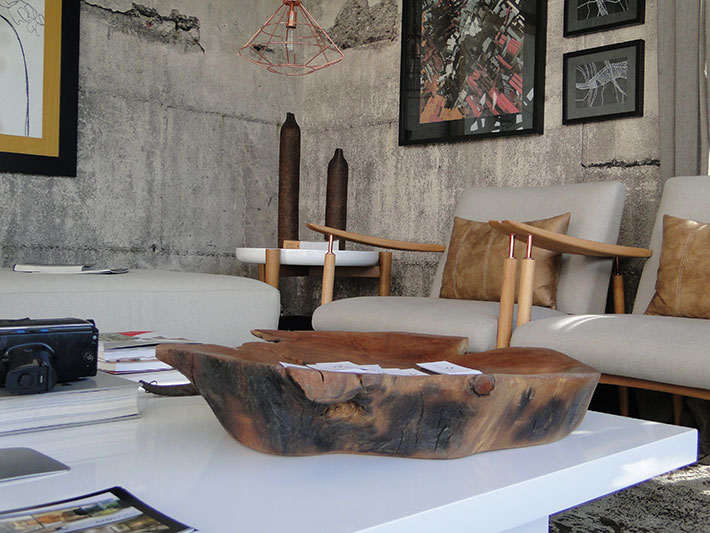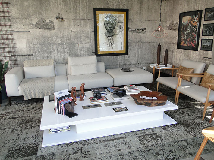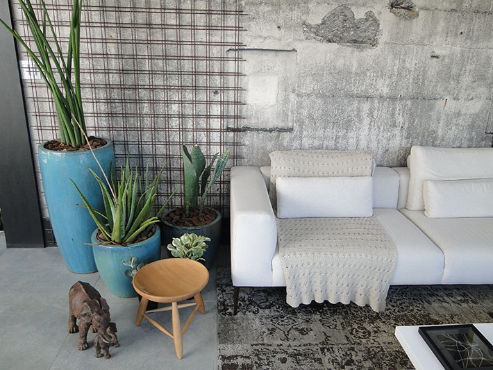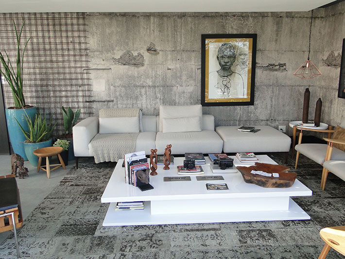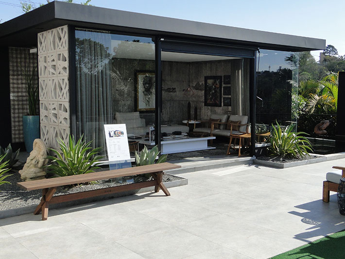 Mas, quem pensa que acabou por aí, cometeu um engano, o revestimento do piso é todo em porcelanato com o efeito de um cimento queimado, o mesmo utilizado para as áreas externas e internas, pois são resistentes ao uso e ao tempo. Os cobogós em cimento, também 3D, são assinados por uma artista plástica, revelando mais estilo ao ambiente, assim como os quadros, obras de artistas reconhecidos nacionalmente, criando personalidade e sofisticação ao cenário criado para à mostra. A mesa de centro, toda em laca branca, apresenta uma lareira no centro que não exala cheiros ou fumaça, pronta para ser usada, apreciando um bom vinho e brindando os melhores momentos desta vida!