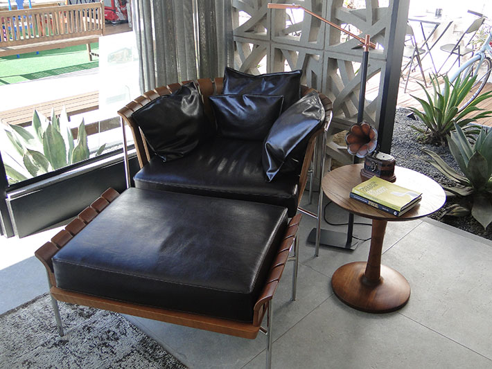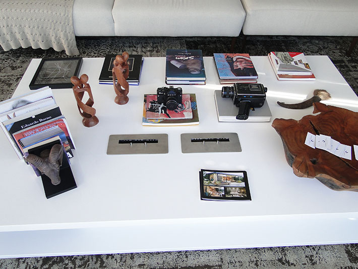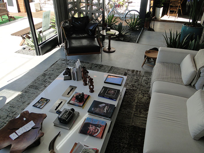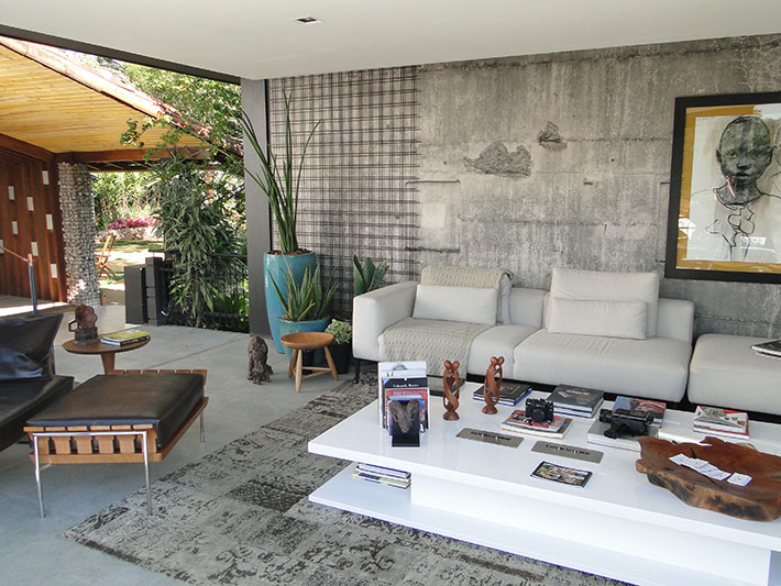 O mobiliário que compõe o ambiente interno é 100% brasileiro, composto por peças assinadas por nomes consagrados do design deste país, como a convidativa poltrona para a leitura e às cadeiras de apoio. O confortável sofá em linho é um convite para apreciar à paisagem do entorno e os objetos decorativos adquiridos em viagens pelo mundo e expostos com uniformidade, criando um link entre si. A iluminação é um verdadeiro show à parte, criando desde um ambiente intimista, como um cenário para festas. "Existem várias cenas, nós focamos em spots para iluminar os quadros, os pendentes da mesa lateral e a luminária de pé em bronze e no ambiente externo uma iluminação que descolamos do piso, toda em LED ", revela a engenheira.