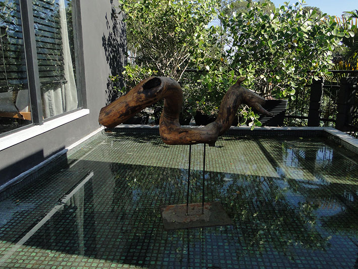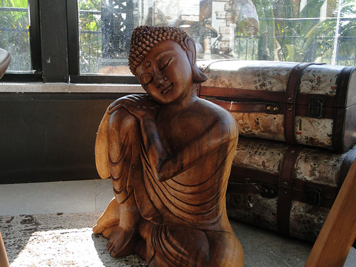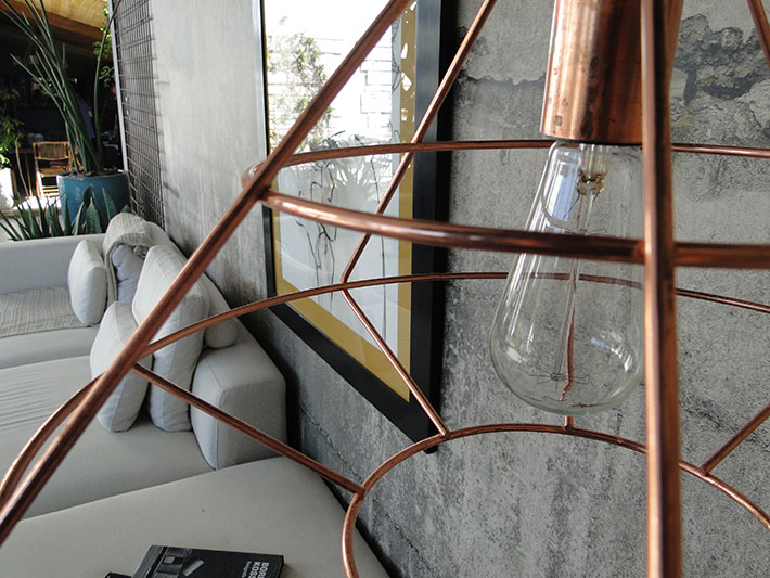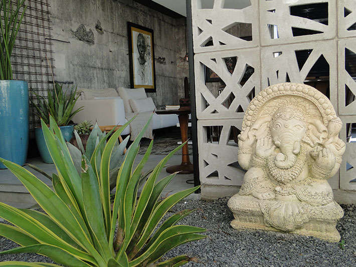 A entrada deste terraço contemporâneo exibe uma vegetação bem urbana, composta por jardins, com espécies naturais de cactus e agaves, contrastando com a deusa Ganesha, um dos nomes mais importantes da tradição hinduísta e védica que rouba todas às cenas. O espelho de águas reflete a escultura em madeira reaproveitada, colocada em um local estratégico, que pode ser apreciada por todos os visitantes. "Nós, preocupamos em colocar no espaço algo que resistisse ao sol e não apresentasse uma manutenção muito grande, ficando um jardim bonito", argumenta Aline.