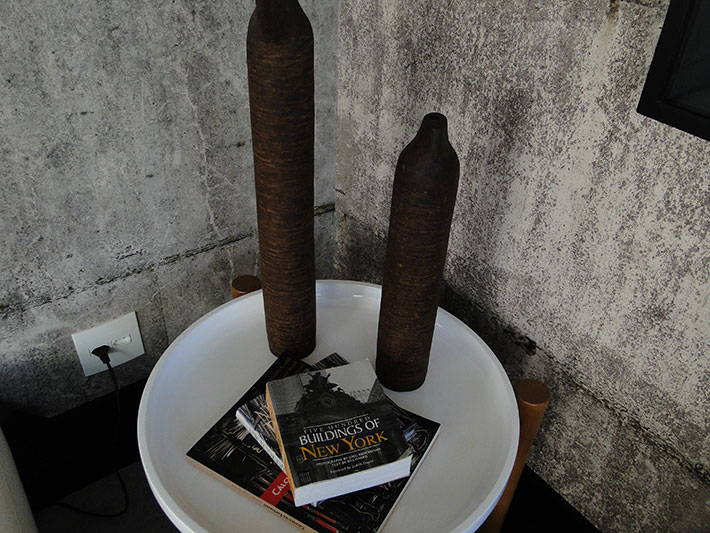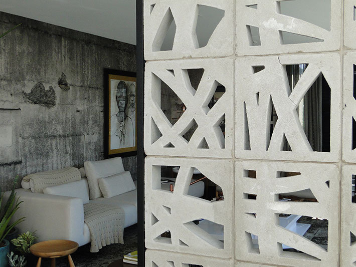 Entretanto, outros detalhes são revelados por si, como o revestimento das paredes internas com vigas aparentes em um concreto bruto, um artifício eficiente para acabamentos irretocáveis. "É um material de tecnologia bem avançada, que é um painel de parede com efeito 3D, é uma serigrafia perfeita de uma parede desgastada, um desenho único, não é um papel de parede e isso inspira as pessoas a aproveitarem o que já está na edificação, você mistura toda à história do lugar com uma ação nova", revela o designer de interiores.