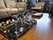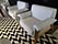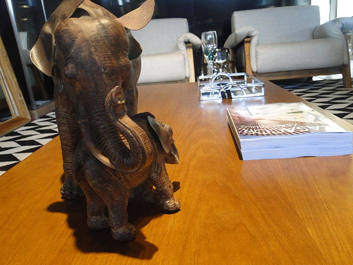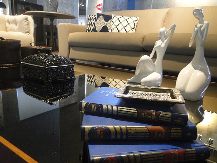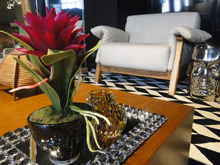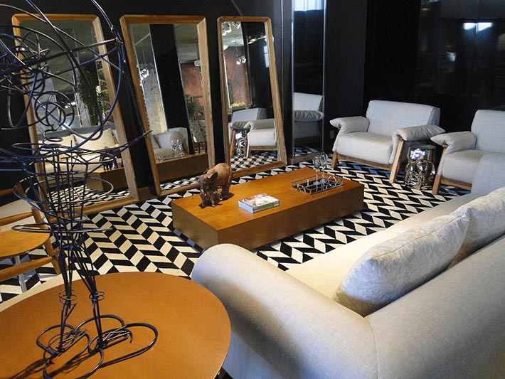 Desta vez, os tecidos em fibras natural de linho promovem a neutralidade das cadeiras, ladeando duas mesas com bases brancas e tampos em madeira tabaco. A outra mesa lateral apresenta um tamanho maior e expõe uma escultura em ferro, refletida através dos três espelhos encostados na parede. Uma luminária de chão, permite à leitura diária e o relaxamento de seus usuários, onde um sofá com extremidades laterais arredondadas propagam o brilho do espaço. A mesa central expõe pouquíssimos adornos, destacando uma animal sculpture. "Eu prefiro um ambiente com poucas informações, neste ambiente o tapete preto e branco já destaca-se, com o uso de muitos enfeites, você não vai enxergar muita coisa, um ambiente clean é sempre mais elegante ", explica a profissional.