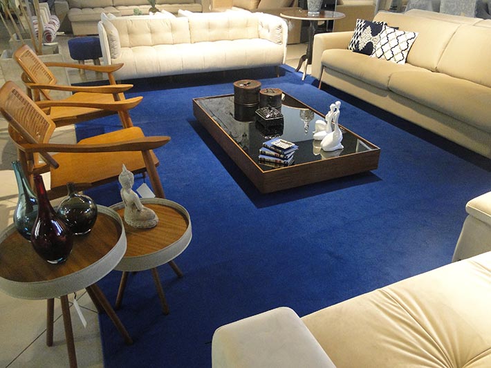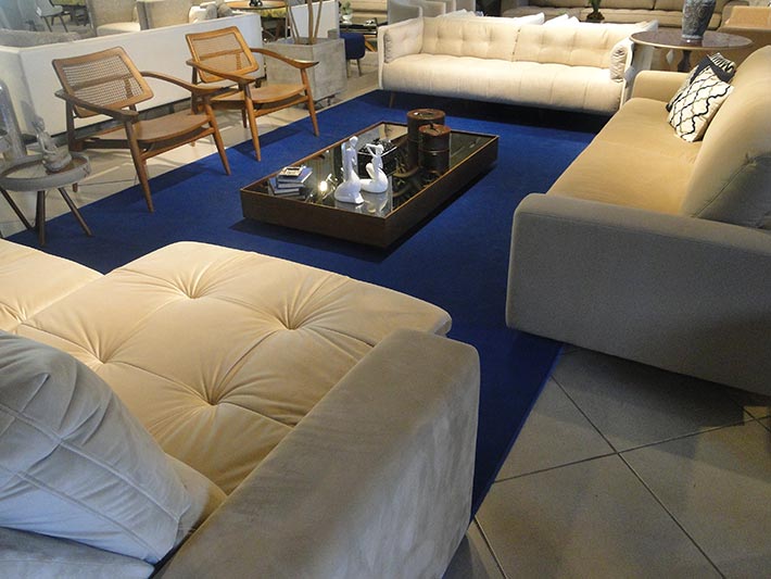 Em nosso primeiro exemplo, um suntuoso tapete azul royal, composto em fibras sintéticas, promove o aconchego do ambiente e permite uma fácil manutenção, onde as cadeiras de aproximação, todas em madeira e com encosto em palha sintética, foram expostas em um único par, ladeando, um conjunto de mesas de apoio, em tamanhos diferentes, exibindo adornos complementares, como jarras coloridas e uma escultura oriental. A mesa de centro retangular expõe poucos objetos e permite um brilho elegante do espelho bronze de seu tampo. Os três sofás retilíneos com modelos distintos e tecidos neutros, completam o ambiente com leveza e sensatez. "Eu gosto muito de tapetes e utilizei cadeiras em madeira pura, sem tecido algum, além de um cachepô, com uma vegetação verde natural, para verticalizar o espaço um pouco, e o verde com o azul, dá um choque interessante", revela a arquiteta.