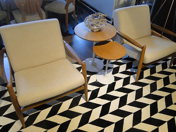 "Também trabalhei com almofadas para dar um contraste e remeter ao tapete, criando um movimento com estas imagens geométricas, que está usando muito", analisa Giovanna. Em nossa segunda opção, o ponto de partida, também foi outro tapete, com o mix de figuras gráficas vanguardistas em preto e branco, onde, a arquiteta utilizou cadeiras e poltronas de aproximação em extremidades opostas, através de uma célebre composição do ambiente.