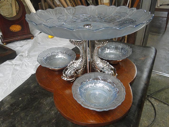 A fruteira com base em madeira e pendentes de sustentação em formato de peixes marinhos, entalhados no metal, precisou de um reavivamento na tonalidade prateada, além disso, o prato em vidro foi cautelosamente composto para o seu uso, observados durante nossa reportagem no seu atelier. "Eu fiz novamente a base em madeira e a parte metálica, que estava toda enferrujada, nós polimos e mandamos dar um banho de níquel e montamos essa peça de família novamente", exemplifica o restaurador. Entretanto, as gavetas emperradas, os pés da base soltos ou a estrutura sem firmeza, são alguns dos fatores que mostram a necessidade de restaurar uma peça, como a alteração nas tonalidades das madeiras, devido a claridade intensa ou sol abundante. "O processo de igualar as peças é uma alquimia, é um dos segredos, existe um espectro grande de tonalidades para você realizar uma intervenção quando à madeira já adquiriu claridade, e foi lustrada com vários produtos ", ressalta Eduardo.