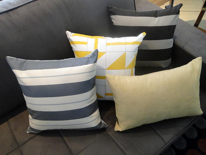 Os sofás de cores sóbrias, que seguem as nuances em tons de cinzas, estão completamente em alta, sejam com tecidos em fibras de linho natural ou sintético, suede ou lonas impermeáveis, e podem sempre, receber almofadas com cores fortes, como o amarelo e vermelho, segundo Cecília. Em nossos exemplos a também designer de interiores Elaine Almeida (Mobiliário) projetou ambientes para receber composições harmônicas de almofadas, utilizando sofás com dimensões e revestimentos diferentes, como também adornos, mesas de centro e apoio, tapetes e quadros contemporâneos, tudo, para ilustrar nossa reportagem.
