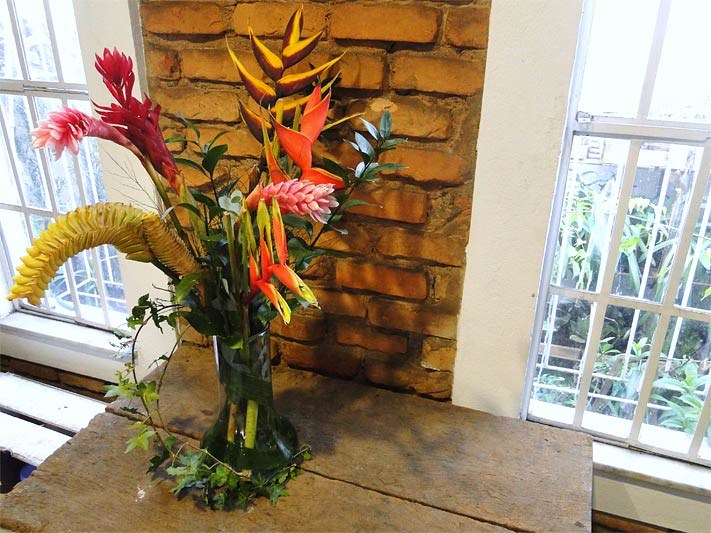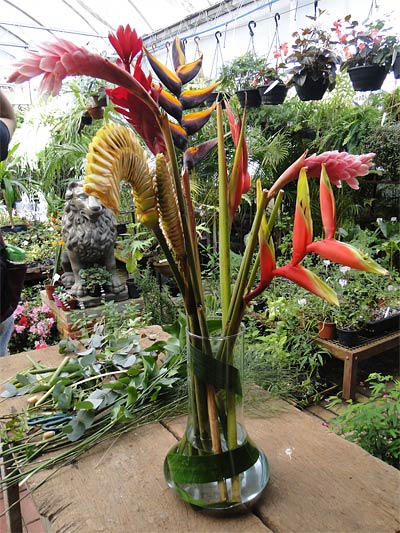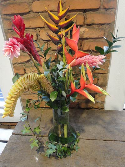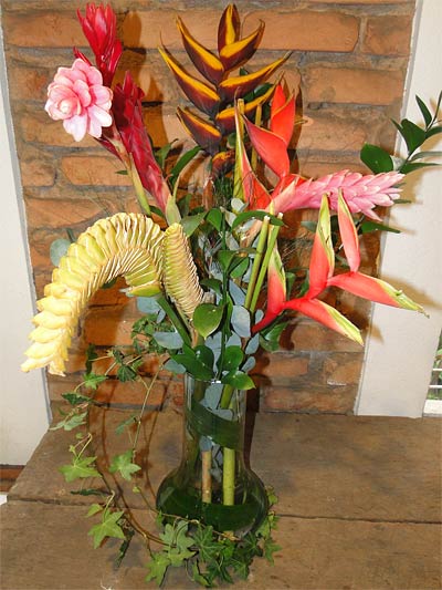 "Para este arranjo, nós utilizamos algumas flores exóticas, como as alpinéas, helicônias, dracenas e as folhagens verdes, como as eras estrelas, eucaliptos, ruscus e vassourinhas", mostra Heloísa Maria. As flores colhidas especialmente para este arranjo, oferecem resistência em ambientes internos, porém, precisam de uma quantidade de água controlada, principalmente nos períodos que compreendem à primavera e o verão. "Estas flores são muito resistentes, você pode colher na época da primavera, sem prejudicar o seu jardim, e duram cerca de 20 dias", fala Heloísa.