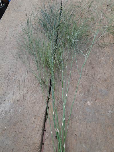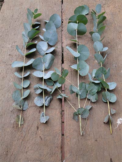 - Coloque os eucaliptos, as dracenas, os ruscus e as vassourinhas, um de cada vez, nesta ordem.