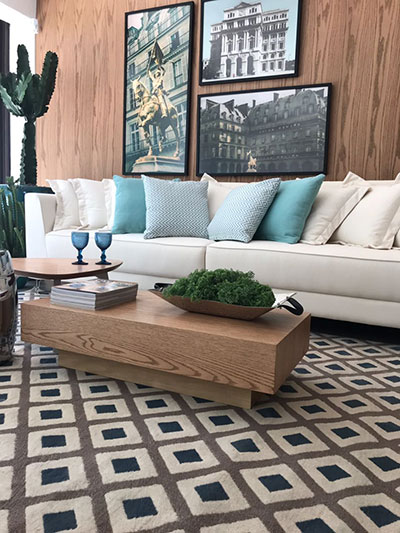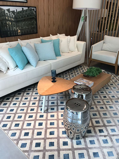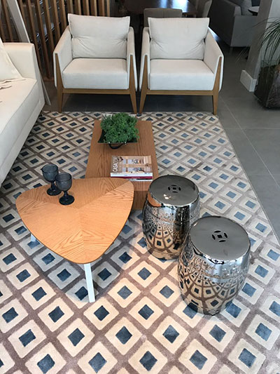 - Tapetes: os tapetes compostos em fibras baixas são fáceis na hora da limpeza e manutenção, caso necessário, poderá ser utilizado em outros ambientes, como quartos e salas de jantar. Harmonize de acordo com a paleta de cores das almofadas e sofás, como em nosso exemplo, com estampas personalizadas em ladrilhos hidráulicos.