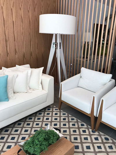 - Poltronas: Os assentos devem ser ergonomicamente confortáveis para as funções de entretenimento, leitura, ou simplesmente relaxar. Os tecidos em linho ou outros em puro algodão, sempre com tonalidades neutras (bege, palha, off-white ou cinza) são recomendados.
