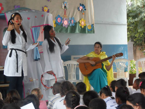Há um mês apenas surgiu a primeira peça com o título: O Coração Partido e o Estômago Apaixonado por Doces, que foi apresentada a crianças de seis a dez anos. A ação começa com um bate-papo entre as integrantes do grupo e os alunos sobre as novas palavras que integrarão o vocabulário – digestão, coronária (artérias do coração), entre outras. Depois a peça é apresentada e na sequencia são trabalhadas as músicas e cantigas populares. "Eu faço as paródias com os assuntos que foram falados nas peças e utilizamos instrumentos musicais para que a interação seja mais legal. Por fim, distribuímos material didático que elaboro para cada peça", explica a endocrinologista.