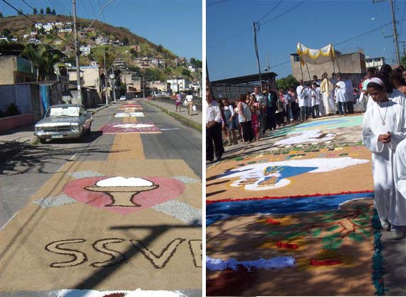 Juizforanos montam tapetes para celebrar Corpus ChristiPara a confecção, são utilizados sal grosso tingido de várias cores, tampinhas de garrafas pet, areia, pó de café, entre outros matérias, que enfeitam as ruas