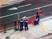 Avenida Rio Branco esquina com a Rua Floriano Peixoto. O cruzamento ? o segundo em n?meros de atropelamentos em Juiz de Fora. No ano de 2002 foram 28 acidentes, nove atropelamentos, um deles com v?tima fatal. Estes s?o os n?meros que comprovam o quanto a travessia ? perigosa e como j? merecia uma reforma. E ? isso o que a Prefeitura de Juiz de Fora decidiu fazer. No fim de fevereiro come?aram as obras da Ger?ncia de Transporte e Tr?nsito (Gettran), cujo objetivo ? impedir que os pedestres atravessem fora dos locais adequados. As mudan?as n?o v?o influenciar o tr?fego do local, e para orientar os pedestres e motoristas, ser?o distribu?dos panfletos com as informa?es de como ser? a travessia.