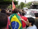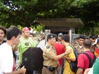 Cantando, desceram a Floriano Peixoto e, no cruzamento com a Avenida Rio Branco, alguns sentaram-se no ch?o e tentaram parar o tr?nsito para cantar o hino nacional. A Pol?cia agiu com for?a, utilizando a cavalaria e sprays de pimenta. Alguns estudantes se machucaram e at? fot?grafos que acompanhavam o evento sa?ram no preju?zo. Um deles foi atingido pelos sprays e o outro levou um pis?o de um dos cavalos da pol?cia. Ele precisou colocar gelo pois o p? inchou muito.