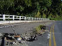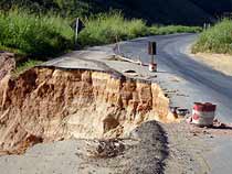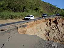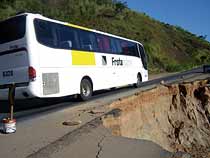 A menos de um quil?metro da ponte, outro trecho parcialmente interditado. Na altura do km 29, metade da pista cedeu e est? afundando a cada nova chuva forte que acontece na regi?o. Mais uma vez, os motoristas utilizam uma ?nica m?o para os dois sentidos do trecho Juiz de Fora - Leopoldina.