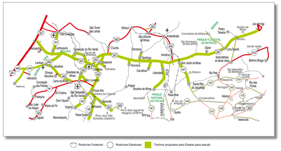 Durante o per?odo de 180 dias de an?lise das empresas, paralelamente, o Departamento de Estradas de Rodagem (DER) de Minas Gerais vai elaborar estudos sobre concess?o e uso de cada trecho, para estabelecer par?metros que v?o nortear os editais de licita??o p?blica a serem lan?ados este ano (clique no mapa abaixo para ampliar a imagem).