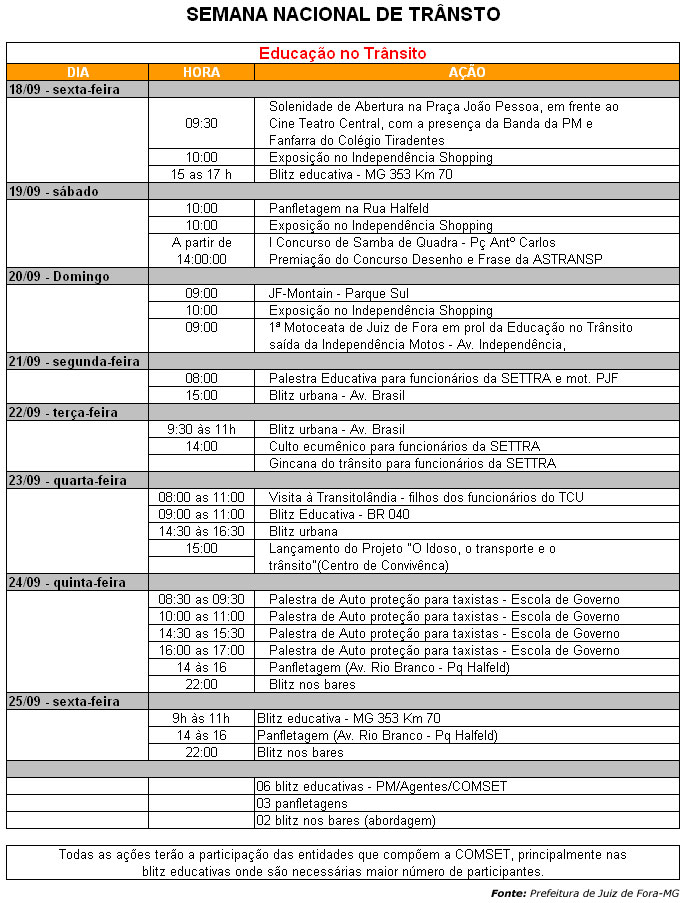 A 40ª Semana Nacional de Trânsito teve começo, nesta sexta-feira, 18 de setembro, em Juiz de Fora. Organizado pela Secretaria de Transporte e Trânsito (Settra) e pela Comissão Municipal de Segurança e Educação para o Trânsito (Comset), o evento teve a solenidade de abertura realizada em frente ao Cine-Theatro Central (foto ao lado). Uma blitz educativa no quilômetro 70 da MG 353 marcou o início das atividades.