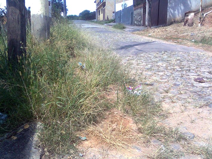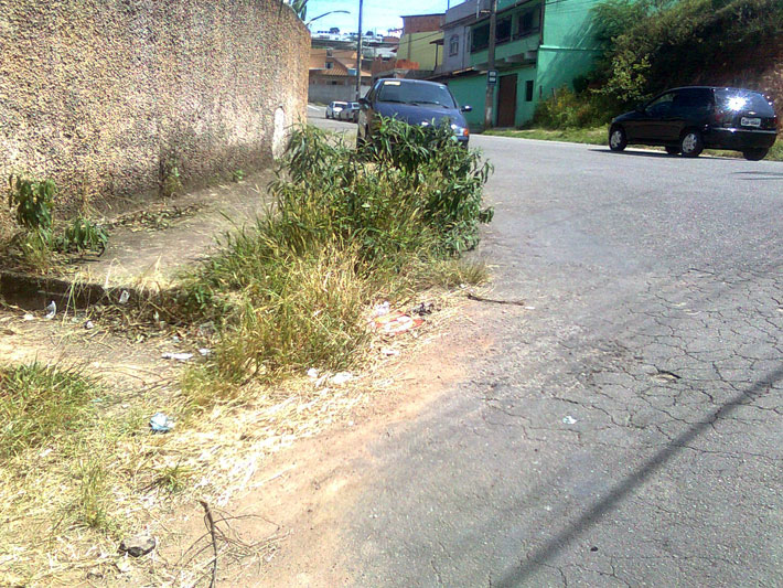 Ainda segundo informações de Lazzarini, na parte alta do bairro também não é feita a capina há cerca de dois anos. "O mato está crescendo e nada é feito. Com isso, os moradores estão andando nas ruas correndo o risco de serem atropelados", conforme a foto abaixo, registrada na rua José Ribeiro de Mattos (ver mapas). No entanto, segundo informações do diretor de operações do Departamento Municipal de Limpeza Urbana (Demlurb), Paulo Antônio Delgado, na rua Maria Luiza de Souza, onde está situada a praça, a capina foi feita há cerca de dois meses. Para atender aos outros pontos, o diretor afirmou que vai enviar uma equipe para verificar a situação do local e agendar o reparo.