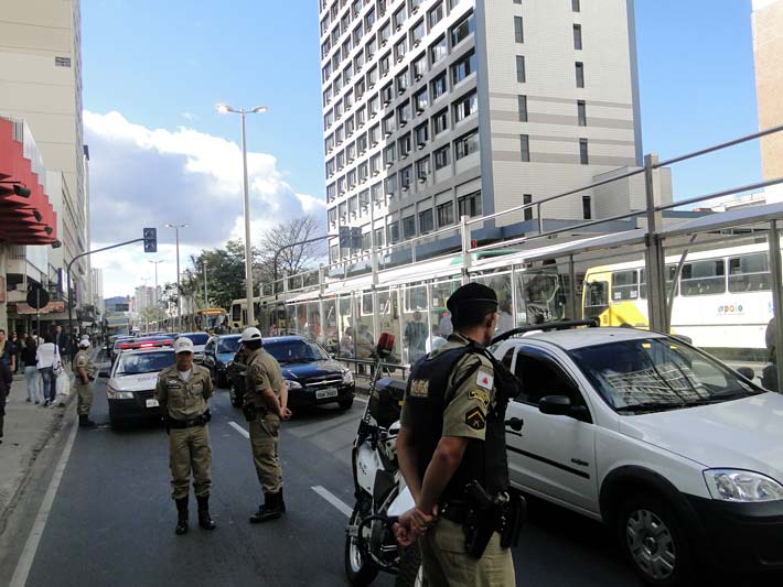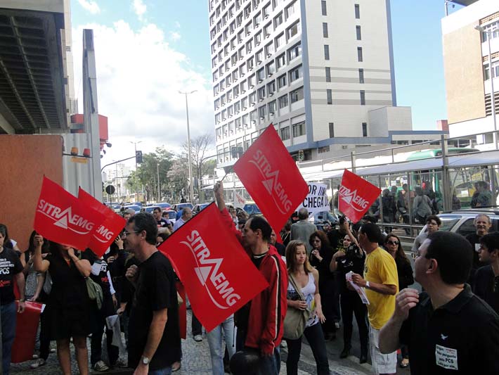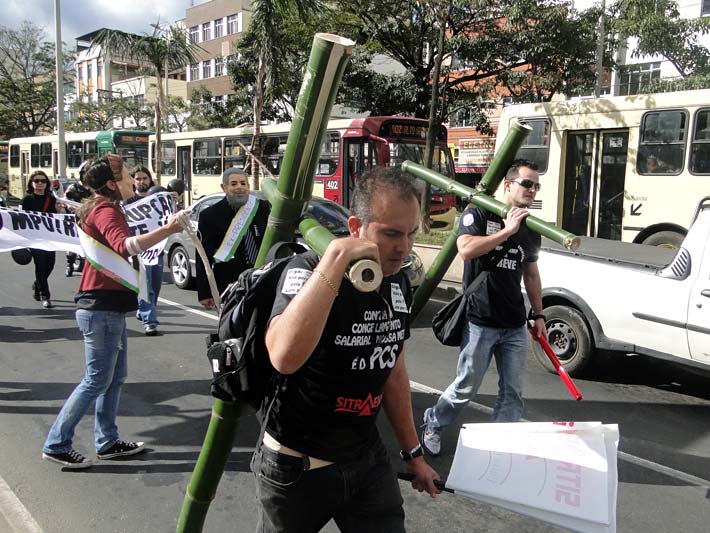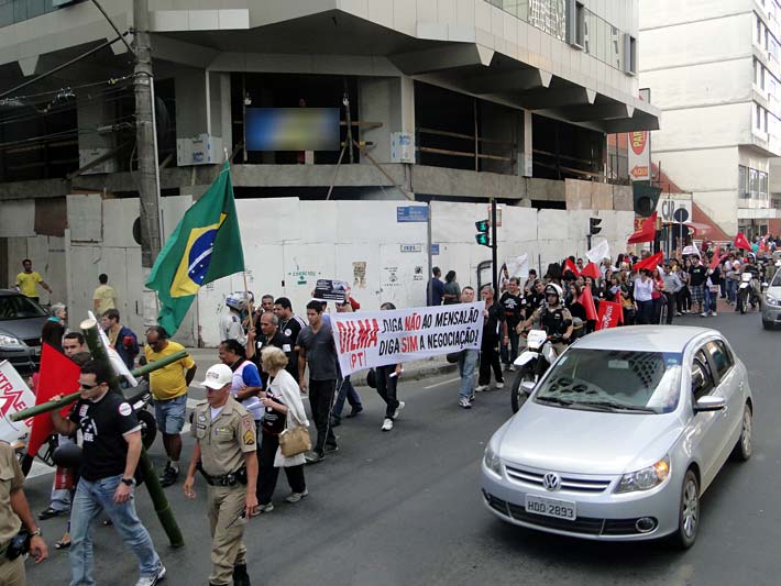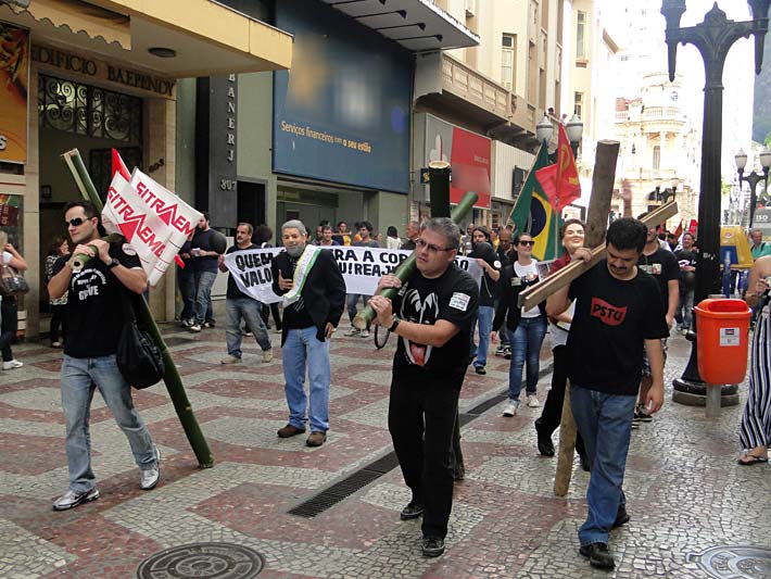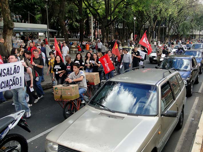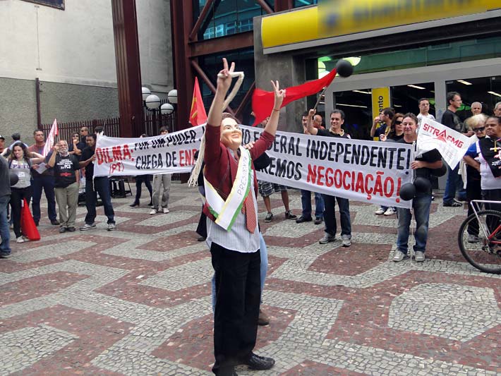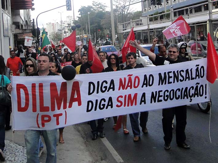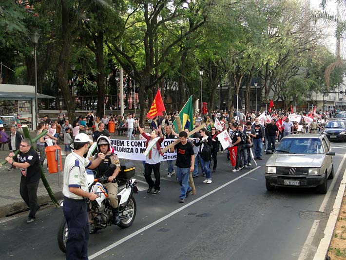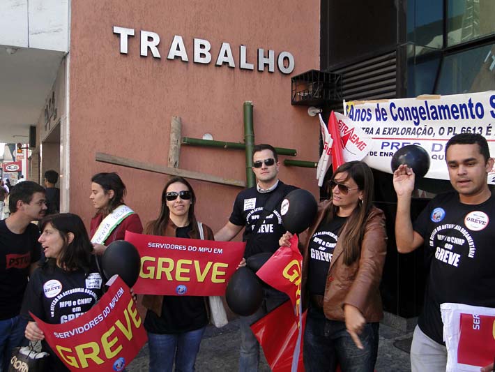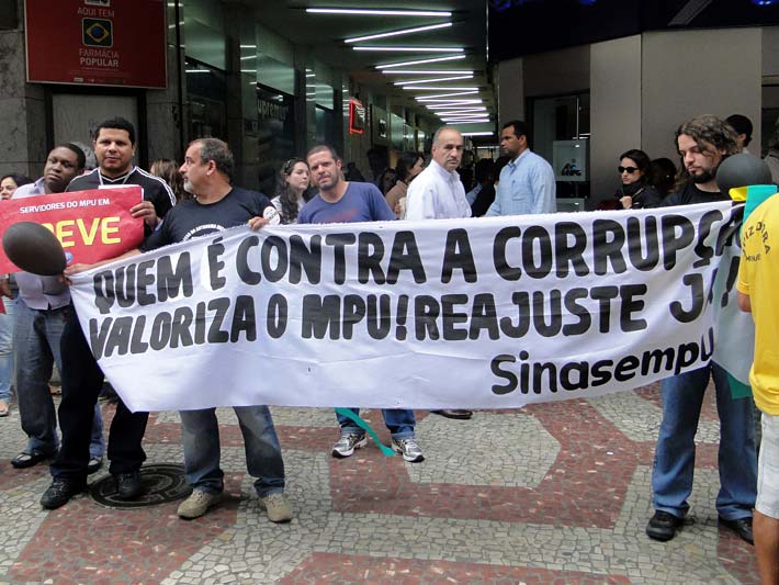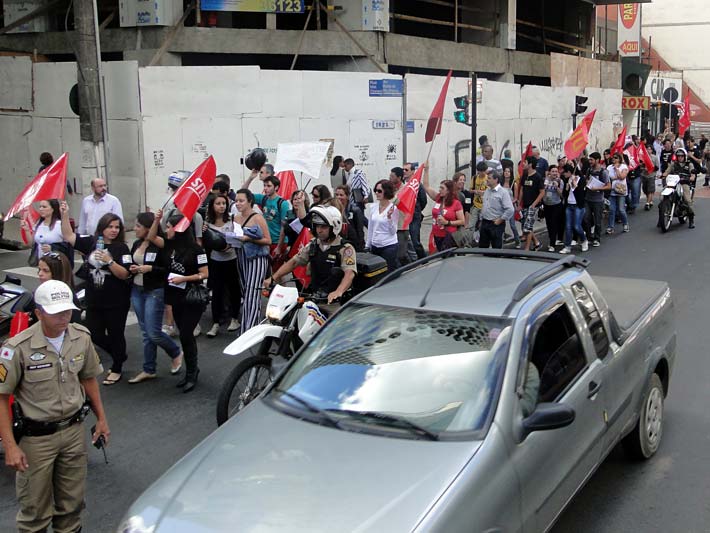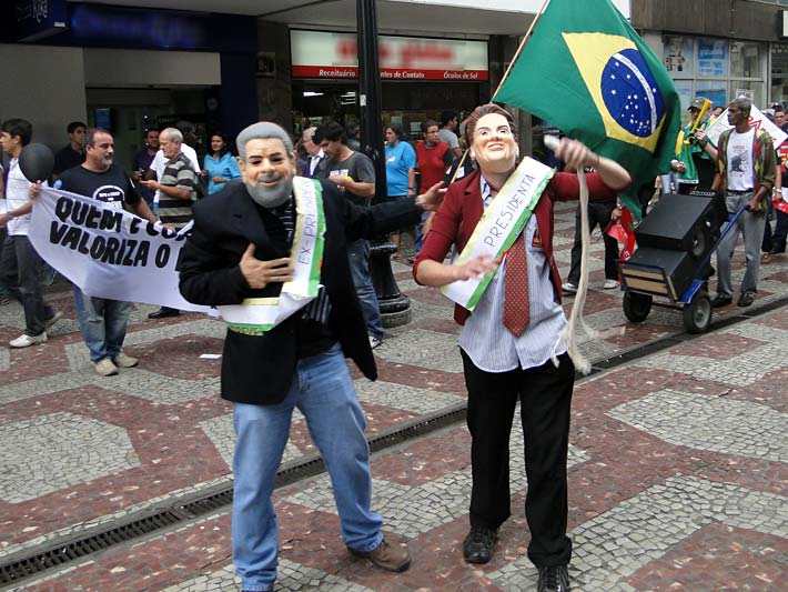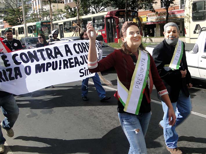 Dezenas de servidores federais de Juiz de Fora realizaram uma marcha pela avenida Rio Branco, no início da tarde desta quinta-feira, 23 de agosto, contra a criminalização das greves. De acordo com a Polícia Militar (PM), cerca de 100 pessoas participaram da manifestação, mas os grevistas informaram que o número chegava a 250. Com faixas, cartazes e máscaras com as caricaturas do ex-presidente da República, Luiz Inácio Lula da Silva, e da presidenta Dilma Rousseff, os servidores seguiram até o calçadão da Halfeld, protestando contra a recusa do governo federal em reabrir as negociações e de algumas medidas adotadas pelo governo, como a instituição do Decreto nº 7.777, de 24 de julho de 2012, que dispõe das medidas para a continuidade de atividades e serviços públicos dos órgãos e entidades da administração pública federal durante greves, paralisações ou operações de retardamento.