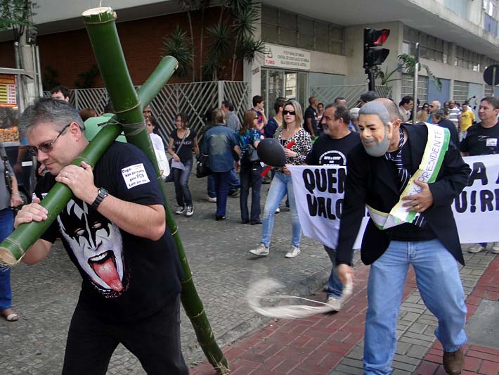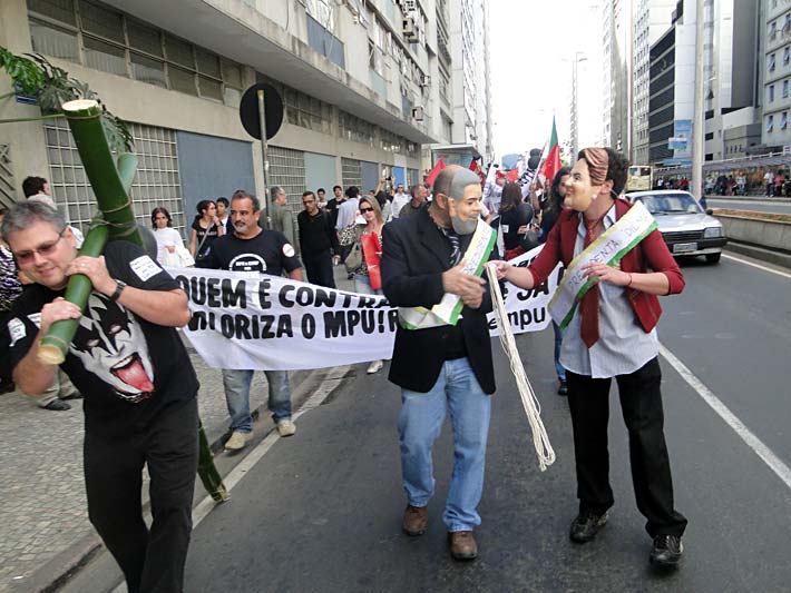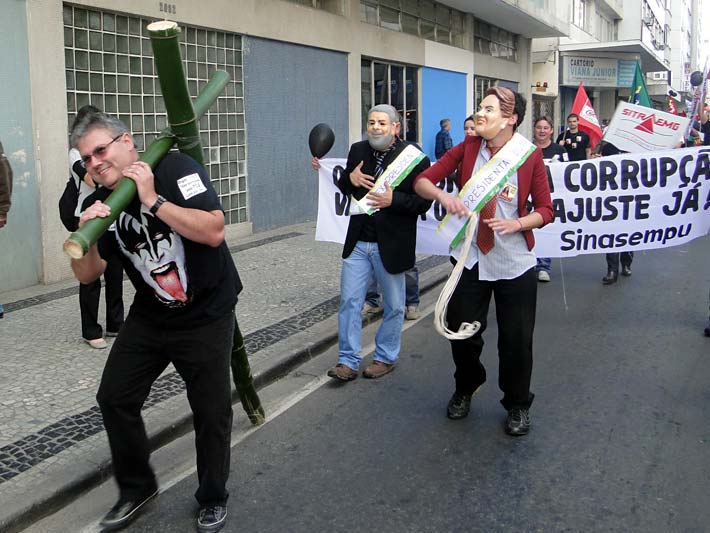 Para o funcionário da Justiça do Trabalho, Alexandre Magno, os servidores se sentem traídos pelo governo federal. "Não entendo como o Partido dos Trabalhadores (PT) pode se recusar a negociar com os trabalhadores. Nós não estamos querendo aumento de salário, o que pedimos é apenas a reposição salarial." Opinião também compartilhada pelo servidor do Tribunal do Trabalho, Pedro Paulo Queiroz. "Nós sempre apoiamos o PT e o que recebemos agora é só descaso por parte do ex-presidente Lula e da atual presidenta Dilma Rousseff." Queiroz, caracterizado como o ex-presidente da República, ressalta que essa forma de protesto quis chamar a atenção da população para o descaso que o governo vem tratando os grevistas. "A cruz carregada pelo servidor, representa o peso que aturamos no dia a dia. Já o chicote simboliza o modo como o governo nos trata."