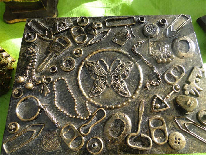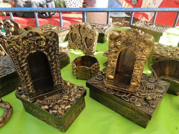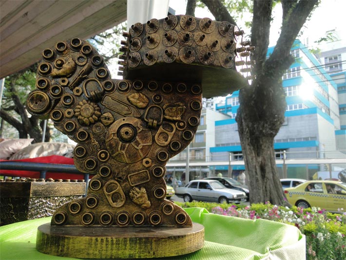 A barbacenense Arlene Saldanha Alves trabalha há nove anos com materiais reaproveitados para confeccionar suas peças, que vão desde caixas de bijuterias até oratórios. "Utilizo todo tipo de material em minhas obras, como anel de latinha de alumínio, chaves velhas, fichas telefônicas e muito mais. Acredito que assim estou fazendo uma bela peça e, ao mesmo tempo, despoluindo o planeta."
