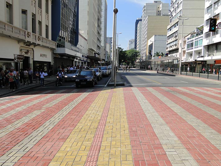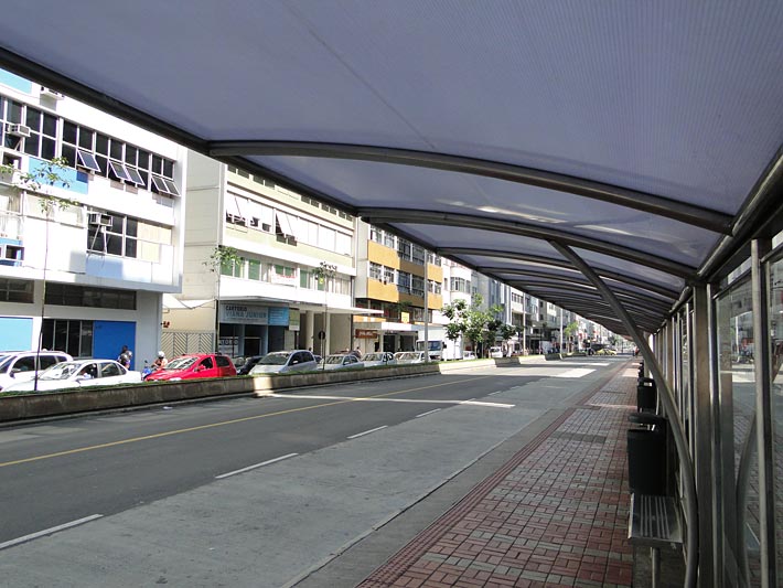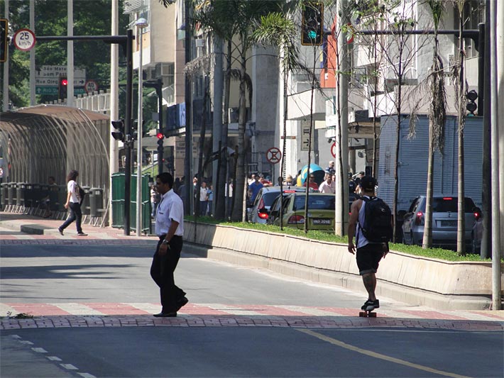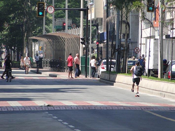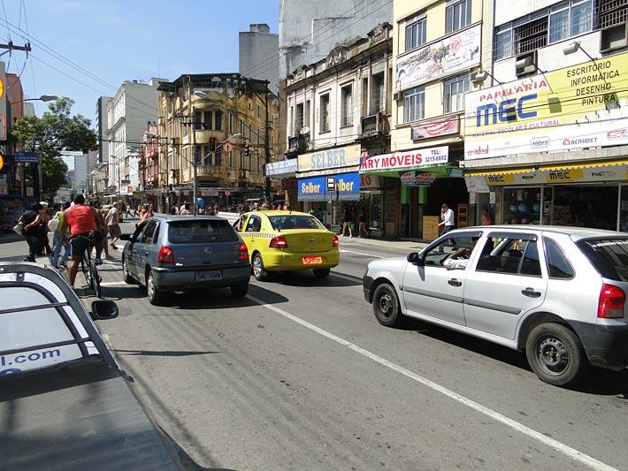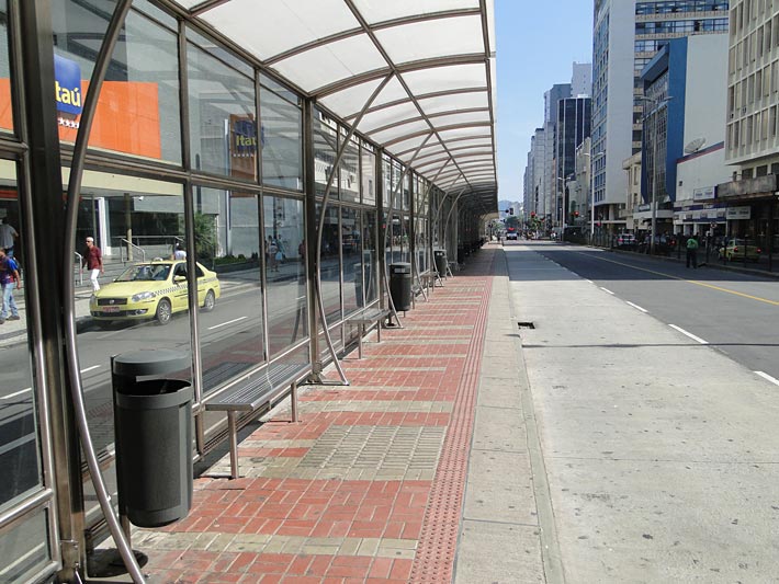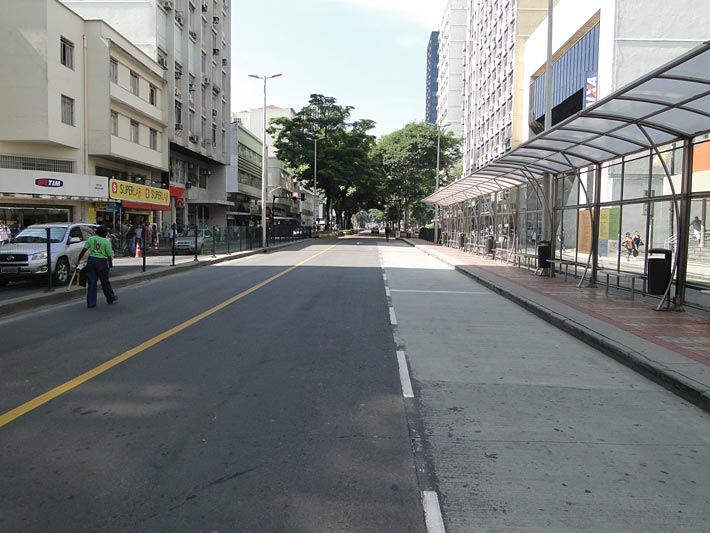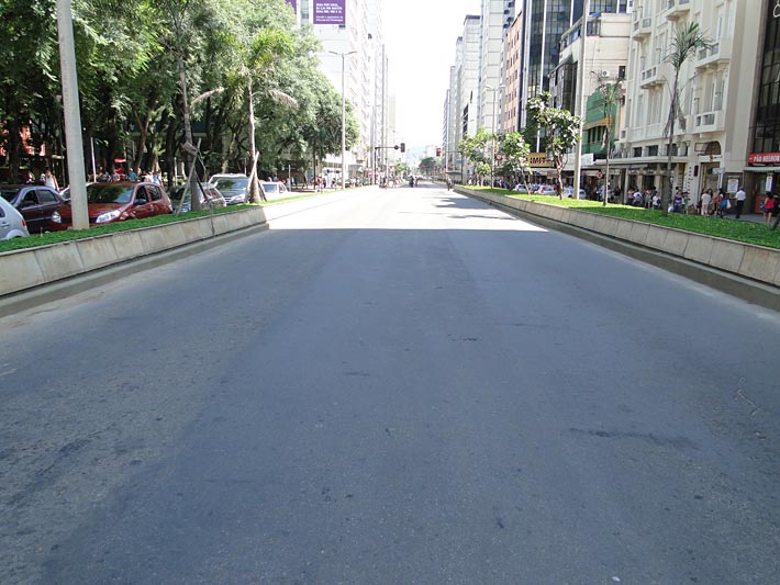 Pela manhã, o contraste era evidente na Rio Branco, com as pistas laterais lotadas por carros de passeio, enquanto a central, destinada aos coletivos, estava completamente vazia.
