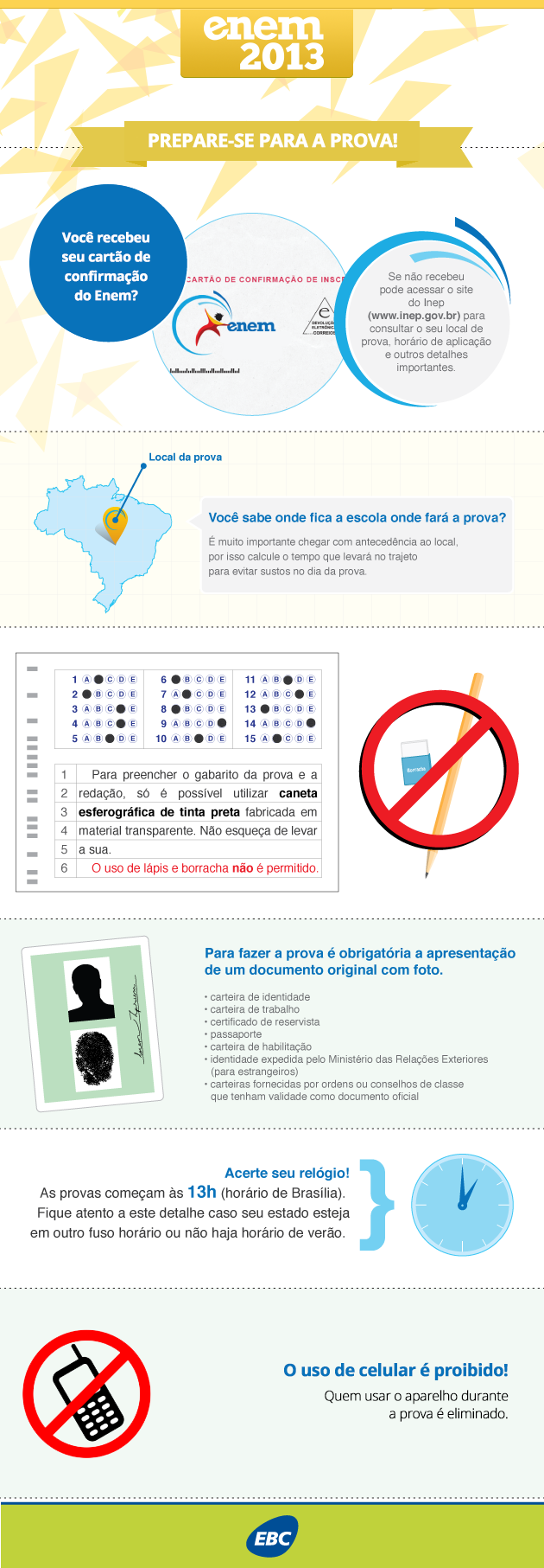 Não é permitido ficar com aparelhos eletrônicos ligados durante a prova. Quem levar qualquer eletrônico, como celular e tablet, terá que guardar em um porta-objetos lacrado que ficará embaixo da carteira. O mesmo vale para materiais como lápis, livros e apostilas. Também não é permitido usar óculos escuros, boné, chapéus, gorros ou viseiras.