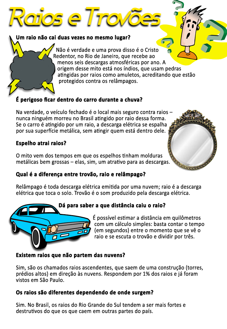 Ferraz ainda dá dicas de como a pessoa pode proceder caso esteja em outras situações. Segundo ele, dentro de um carro é a melhor condição, já que ele se torna um isolante, desde que não seja conversível e esteja com os vidros fechados. Em uma área mais aberta como praias e no campo, explica, "é preciso evitar ficar como ponto mais elevado daquela área e dentro da piscina ou do mar, já que a água é um forte condutor elétrico e também pela sua condição plana." Luciano diz ainda que é necessário evitar se abrigar debaixo de árvores."